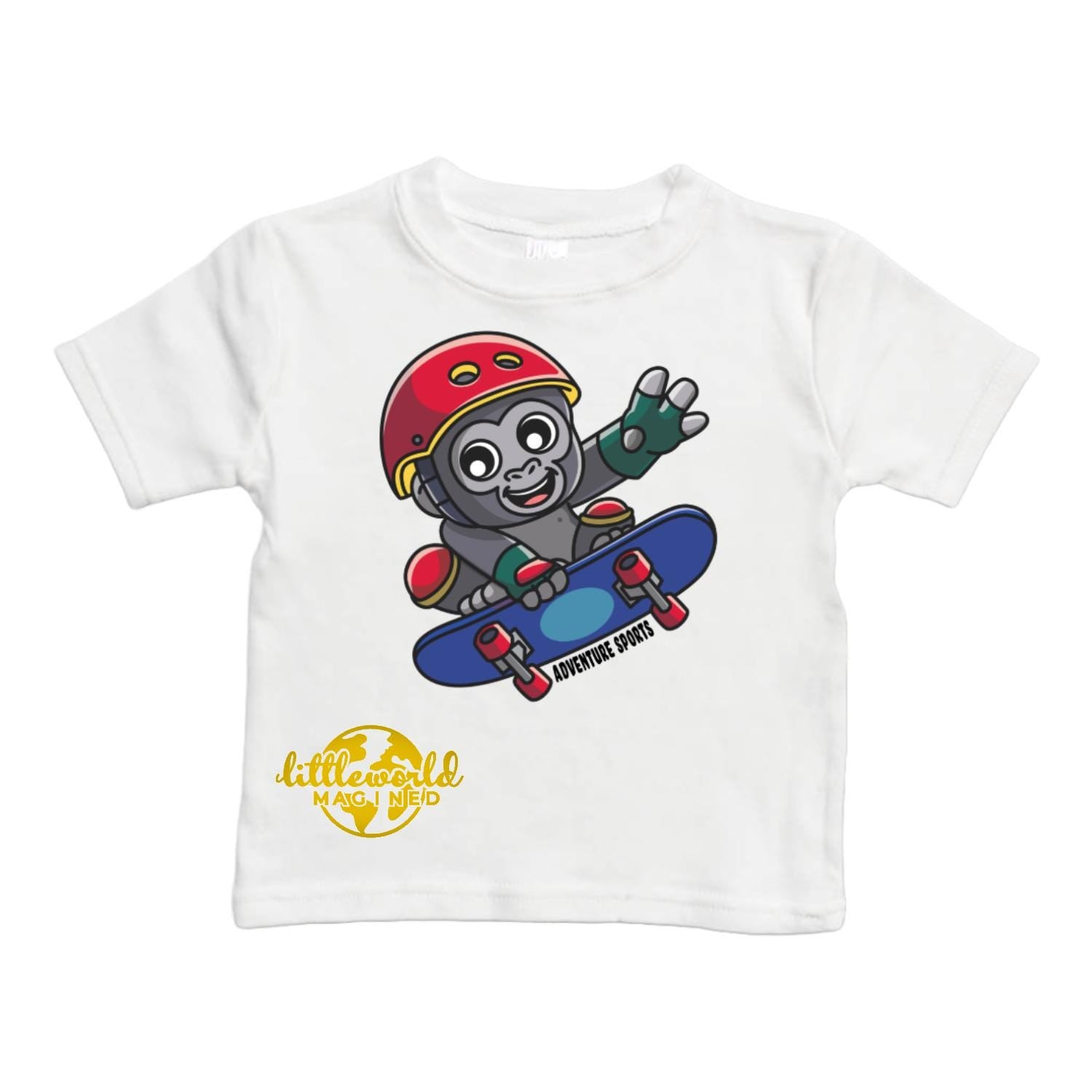 Made from 100% soft ring-spun cotton, this action-packed tee features Malik the Gorilla in full adventure mode on his skateboard. Comes in classic white with a vibrantly colored image for everyday daring.
